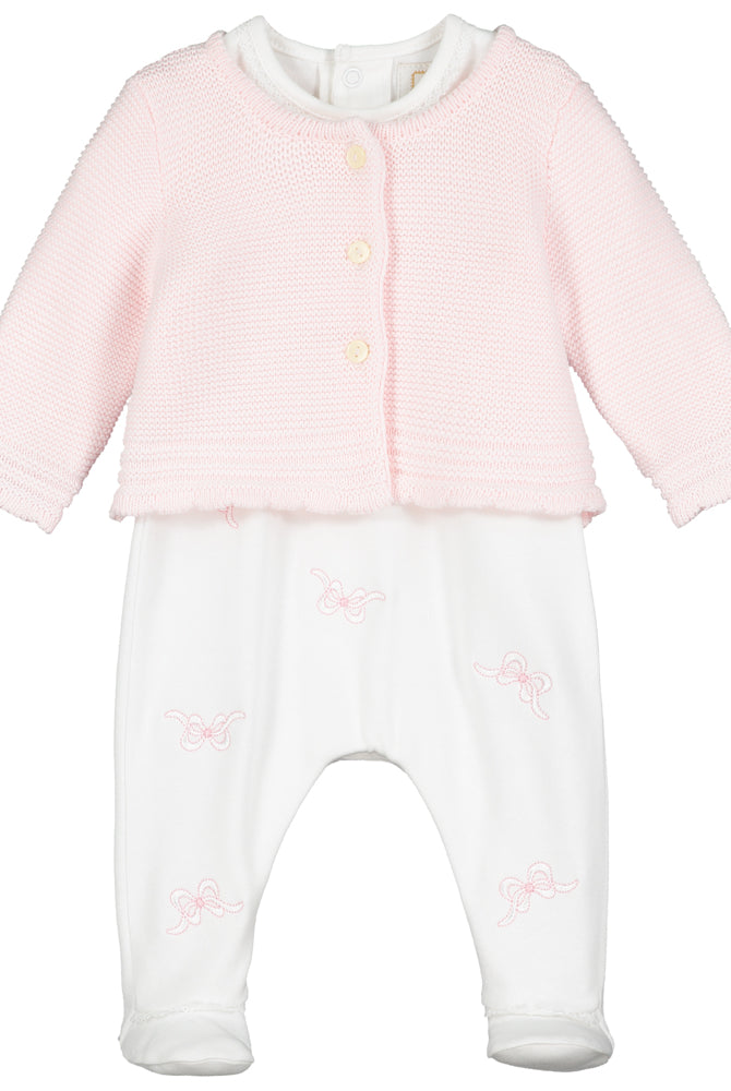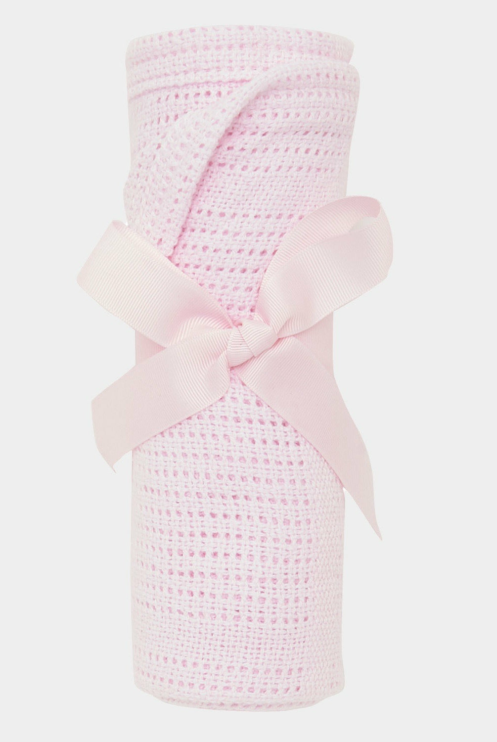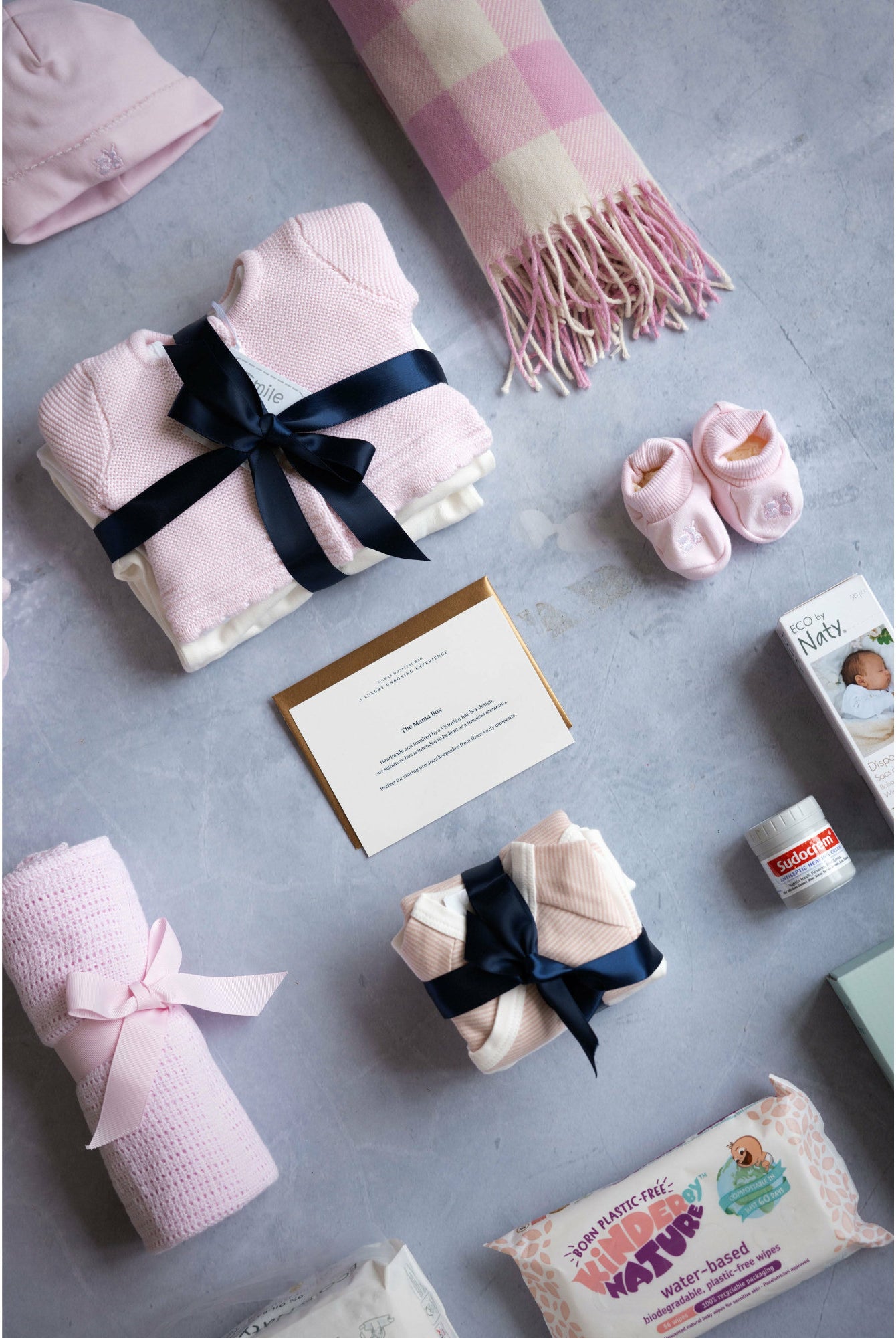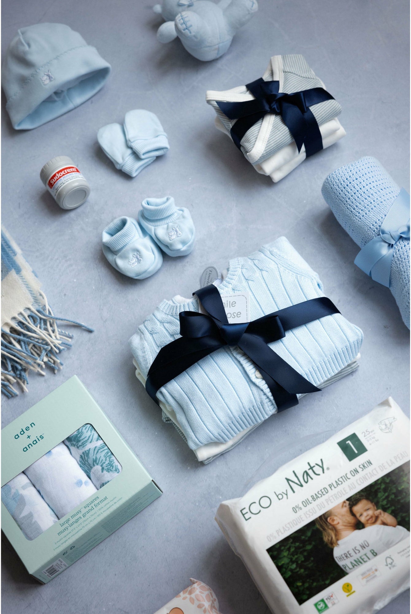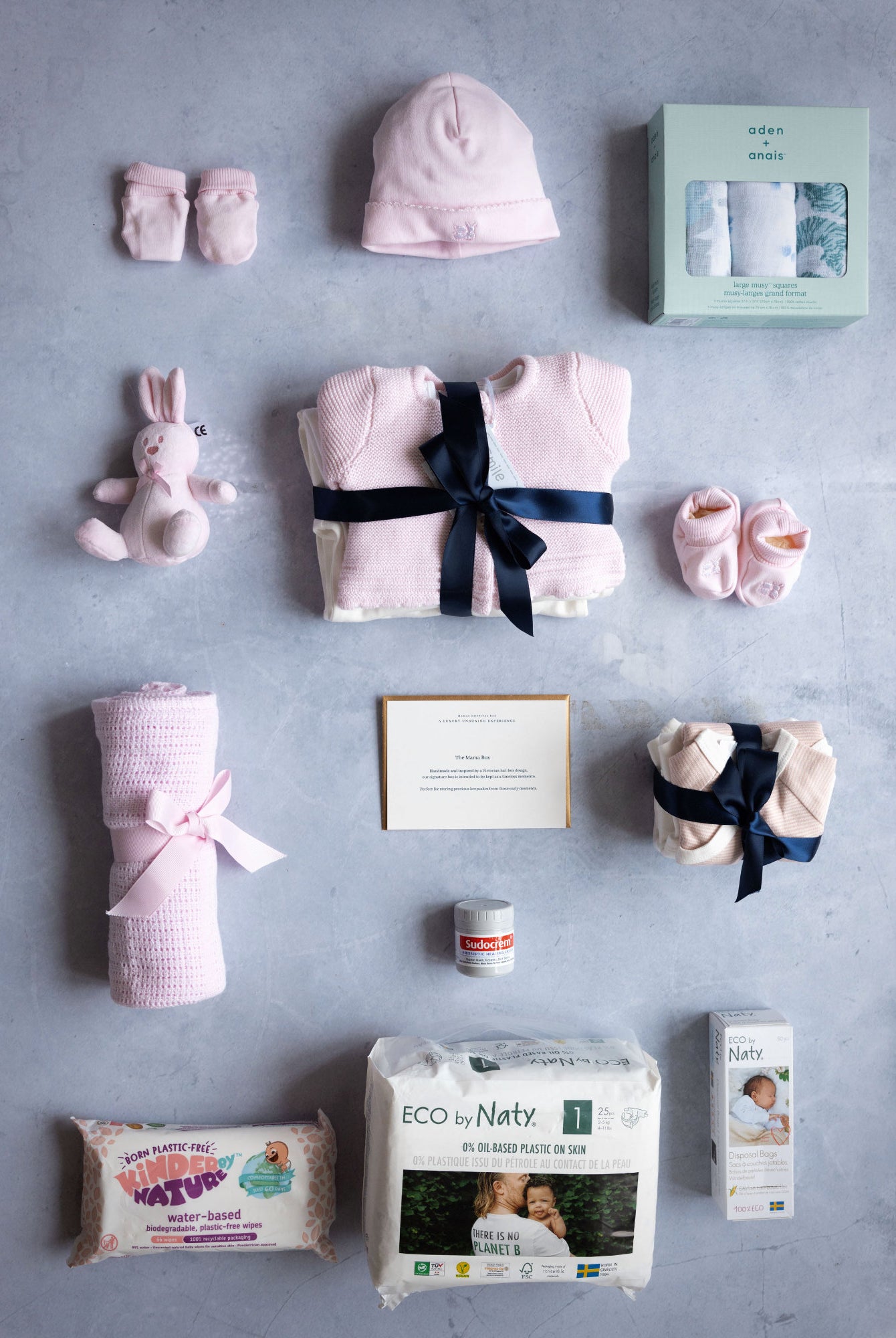 A collection of baby items laid out on a grey background, including a baby hat, sleepwear, a cardigan, long sleeve vests, a hat with a bow, a cellular blanket, a cuddly toy, muslins, a pack of nappies, and a pack of wipes, all in a branded packaging.