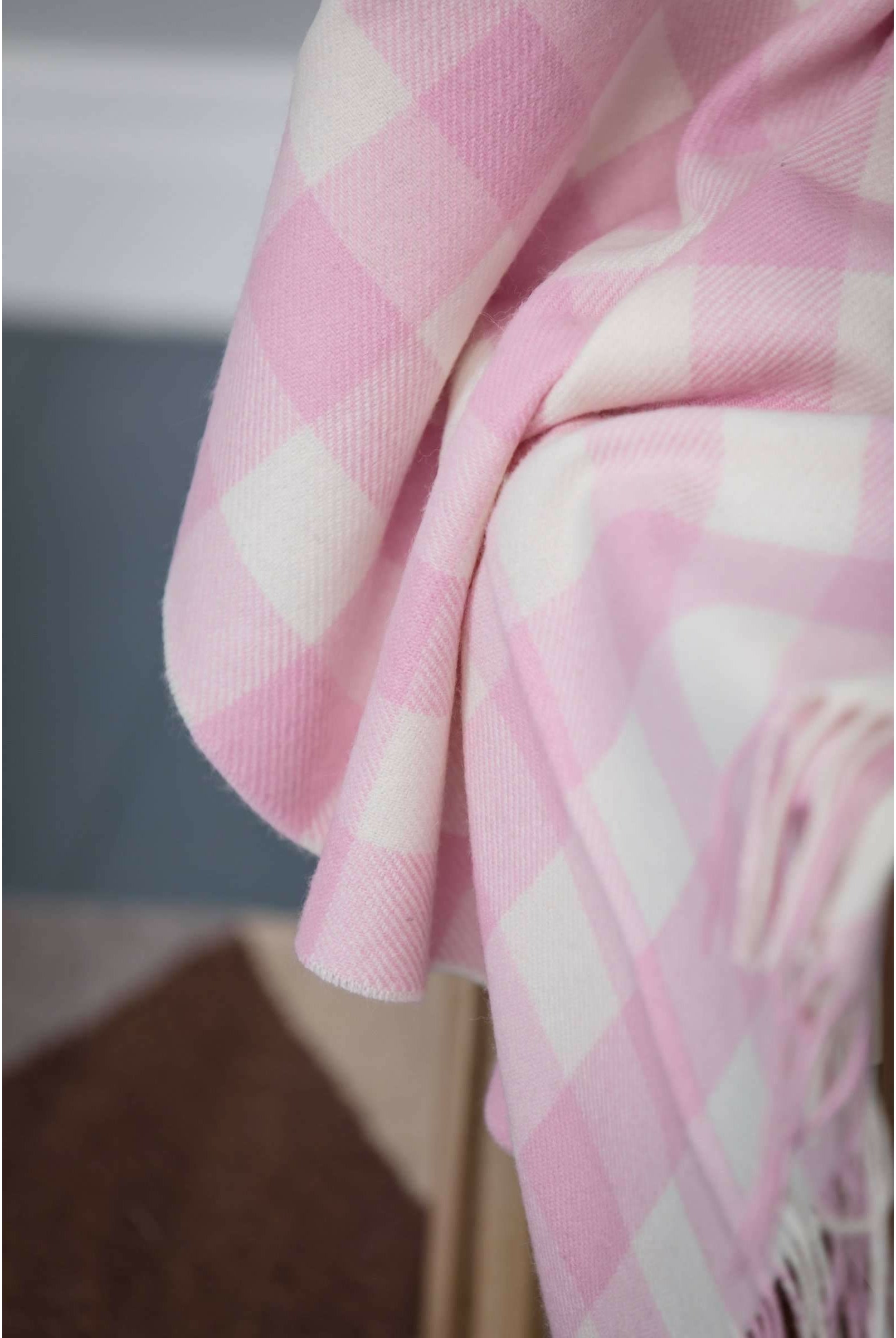 Close-up of a white garment with a pink logo on a textured surface