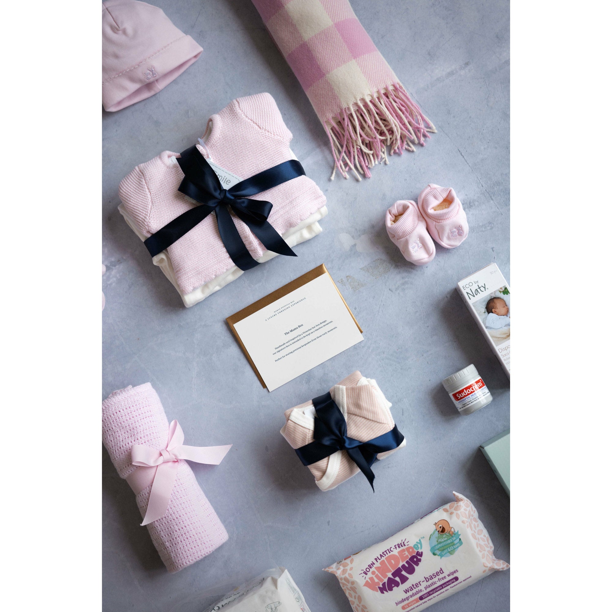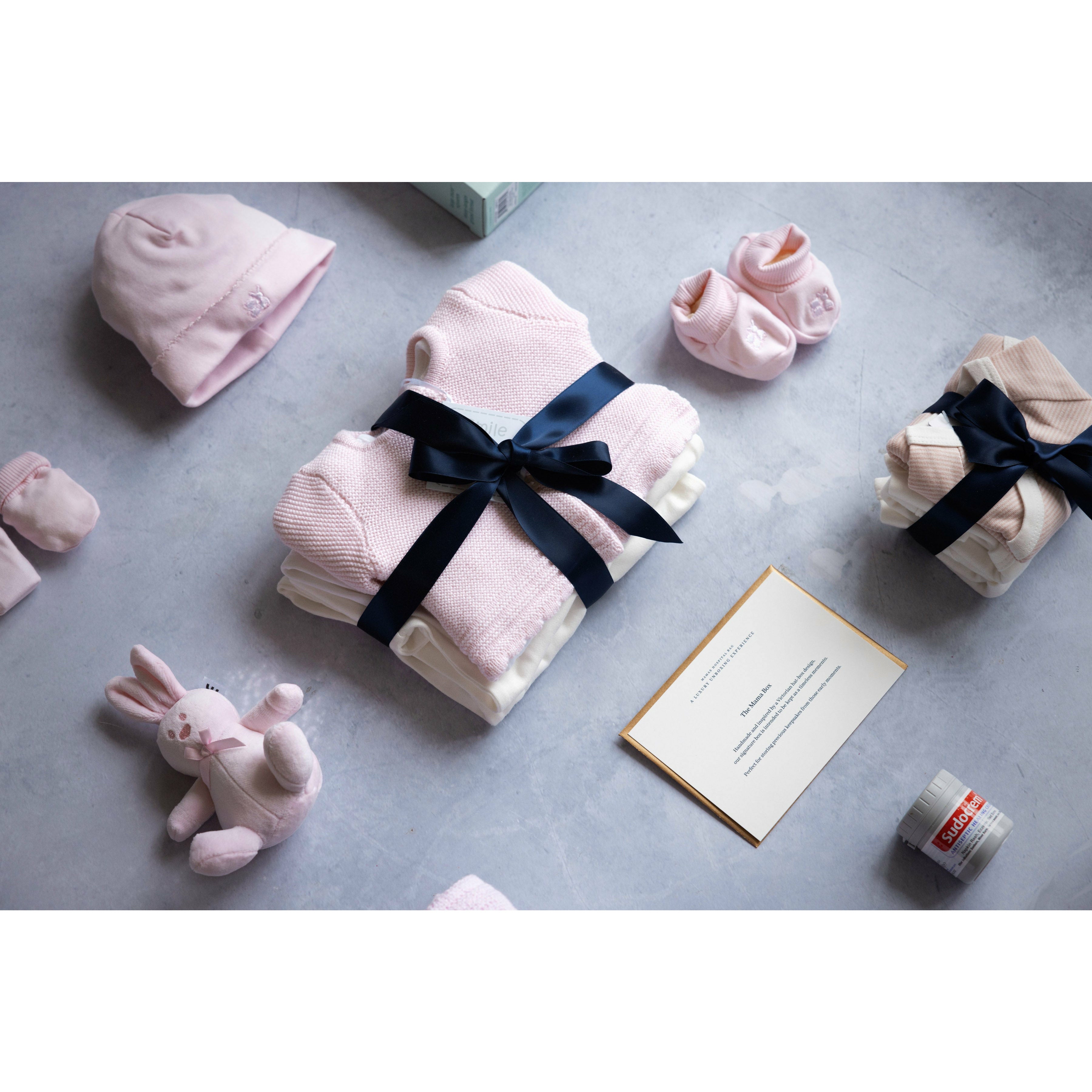 • Premium Quality – Our gifts are carefully curated and beautifully presented, featuring organic cotton & bamboo baby essentials and keepsake gift boxes inspired by classic hat boxes and storybooks.